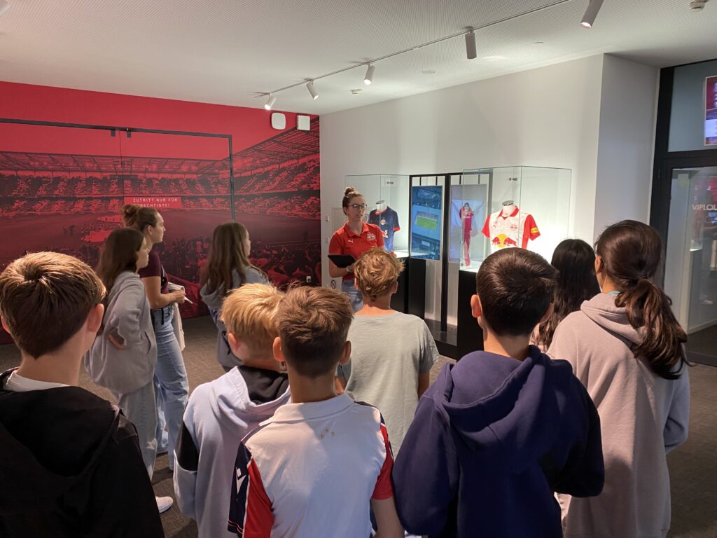 Neben tollen Einblicken in die VIP Loungen und Spielerkabinen, erfuhren die SchülerInnen, wie ein Spieltag eines RedBull Spielers abläuft oder auch, wie der Fußballrasen gepflegt werden muss.