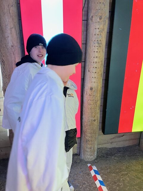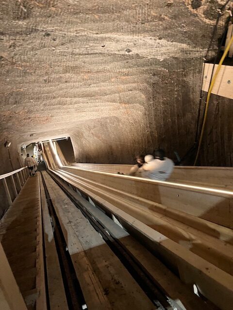 Da machten wir eine Jausen Pause. Die anschließende Tour dauerte 1,5h. Nach einem kurzen Video in einem kleinen Kinosaal fuhren wir mit dem Grubenhund in den Berg rein. Unter der Erde angekommen gingen wir den Rest zu Fuß. Bei der Führung gab es viele Stopps und da gab es Filme, wie früher Salz abgebaut wurde. Auch unsere Guidin erklärte in sehr gutem Englisch und Deutsch, wie man früher Salz abbaute. Heute werden neue Technologien verwendet, früher musste man alles mit der Hand machen. Nach eine Weile rutschten wir eine Rutsche hinunter. Als Nächstes gab’s eine zweite Rutsche, die doppelt so lang war, wie die erste. Sie war sehr schnell und wir durften immer zu zweit oder dritt rutschen. Unterwegs überschritten wir außerdem die Grenze zu Deutschland und gingen 200m unter der Kirche durch, also im Berg. Nun fuhren wir mit einem Boot über einen Salzsee. Die Höhle war früher einmal zum Salzabbau verwendet worden. Bei der Überfahrt sahen wir eine Lichtschau.